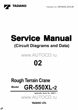 Заводская инструкция по ремонту крана Тадано - Tadano Rough Terrain Crane GR-550XL-2 содержит подробную информацию о сборке и разборке агрегатов, процедур диагностики, электрические схемы, моменты затяжек и др. Информация доступны на Английском и Японских языках. Если модель поставлялась только на локальный рынок Японии инструкции будут на Японском языке, книга с электрическими и гидравлическими схемами будут на английском.